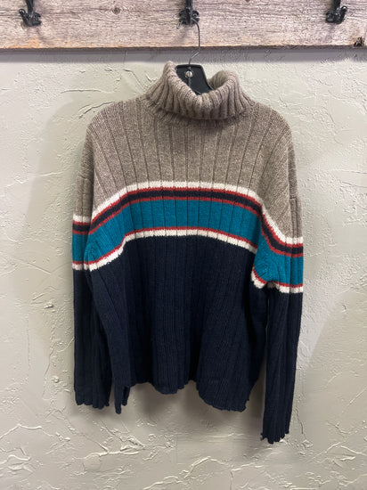 Description : Vintage 90's ribbed sweater featuring a high turtleneck, primarily in a light brown color with a dark navy blue bottom section, accented by horizontal stripes of teal, rust, black and white.