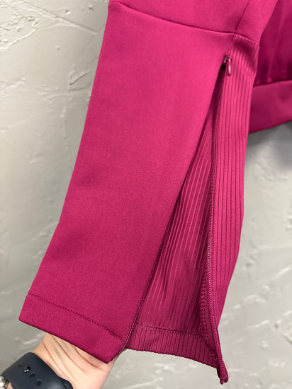 Description : Fuchsia/magenta zip-up Adidas track jacket with a stand collar, full front zipper, long raglan sleeves, ribbed hem, and a small white Adidas logo on the left chest. The silhouette is sporty with a slightly cropped length and smooth athletic fabric