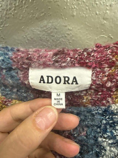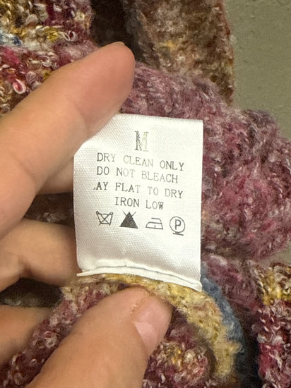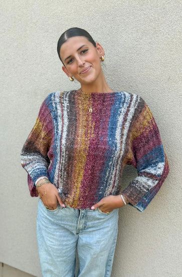 Description : Loose, textured knit sweater with a wide rounded neckline and dropped long sleeves, featuring vertical multicolored stripes in muted burgundy, mustard, denim blue, gray and cream. The fabric is soft and slightly fuzzy with a relaxed boxy fit.