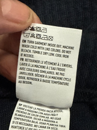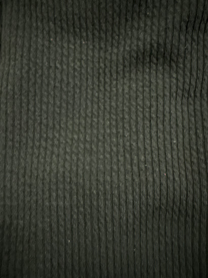 Description : High-waisted, ribbed knit navy blue flared pants with a fitted hip and wide bell-bottom legs, featuring a simple elastic waistband and no closures or pockets.