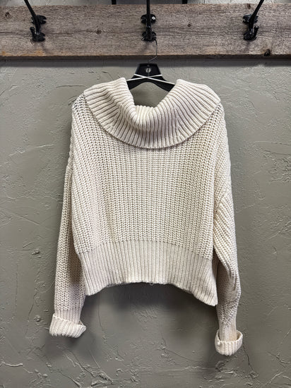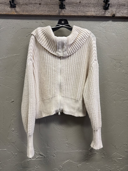 Description : Cream chunky knit zip-up sweater with a wide fold-over ribbed collar, visible central zipper, long sleeves, and ribbed cuffs and hem; the body features a textured stitch pattern. The sweater has a slightly cropped fit and relaxed shoulders