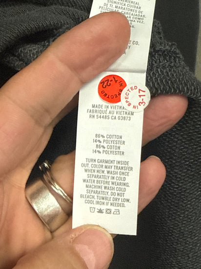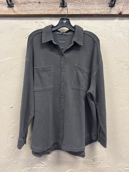 Description : Long-sleeve, oversized button-front shirt in a faded charcoal gray with a pointed collar, two front patch pockets and visible seam/topstitch detailing, made from a soft sweatshirt-like knit.