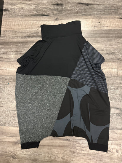 Description : Harem pants in a patchwork design of dark neutrals featuring black, charcoal gray, heather gray and patterned navy-gray panels with a roomy dropped-crotch silhouette, tapered ribbed cuffs, and a wide waistband.