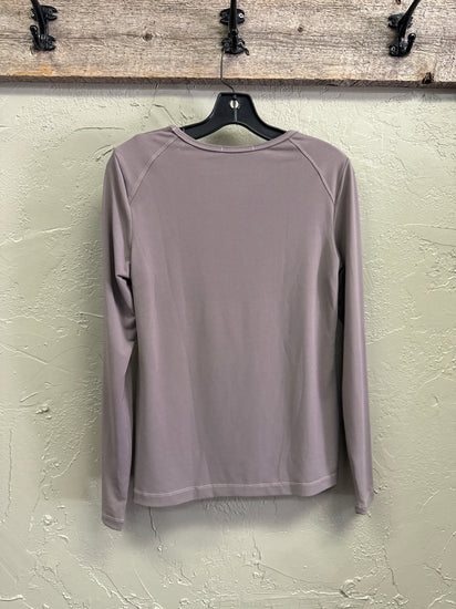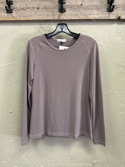 Description : Designed for travel, this long-sleeve crewneck top in a muted dusty mauve-gray color with visible flatlock seams at the shoulders and hem is the perfect staple.