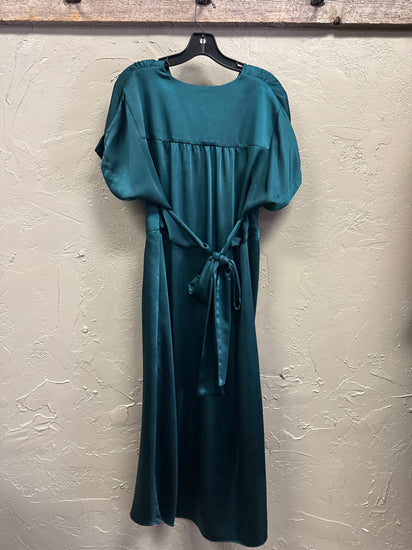Description : Emerald green satin maxi dress with a deep V crossover bodice, wide fitted waistband and gathered skirt; it features short dolman sleeves and a flowing, slightly glossy finish. The fabric is smooth and drapes for an elegant, evening look.