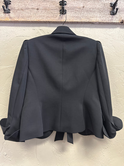 Description : Black structured blazer featuring a peak lapel collar, open front with a tied bow closure, long sleeves with black satin cuffs and two front flap pockets.