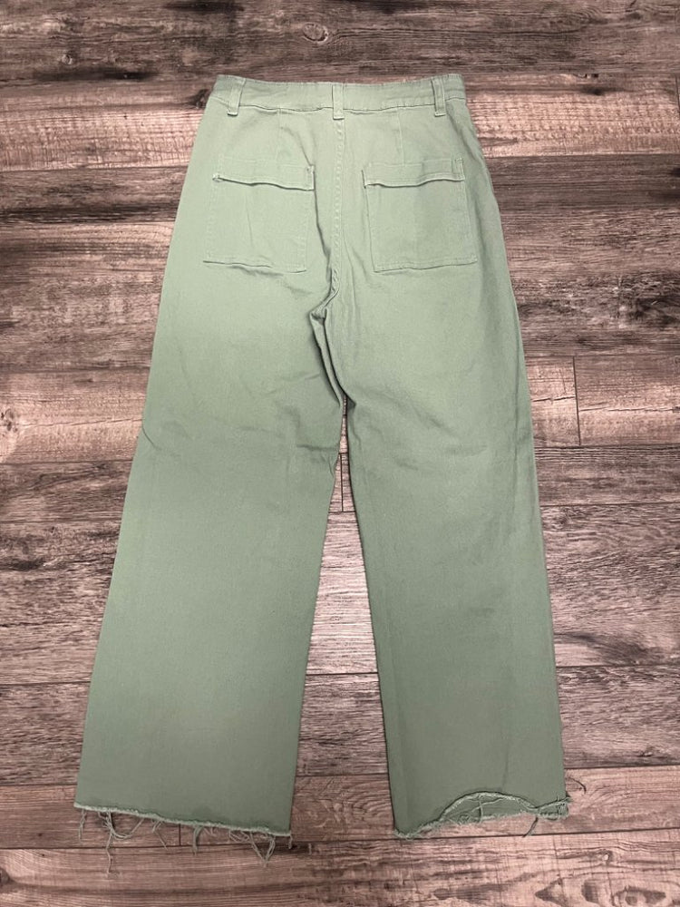 Description : Add a trendy option to your jean collection with this wide legged pair! It features a stretchy denim material, high waistline with belt loops, hidden zip fly, button closure, functional back pockets, and a relaxed silhouette that ends in a wide unfinished hemline with a frayed detail.