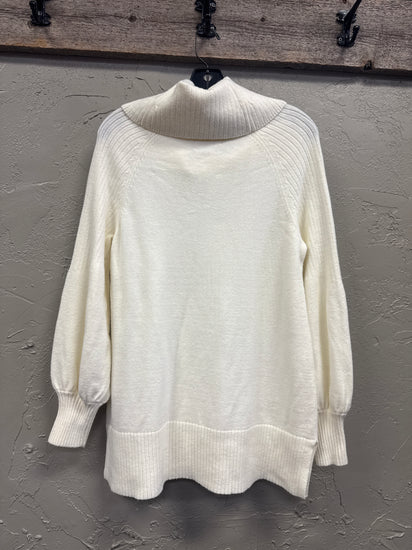 Description : Oversized, cream-colored sweater featuring a cowl neck and ribbed cuffs and hem