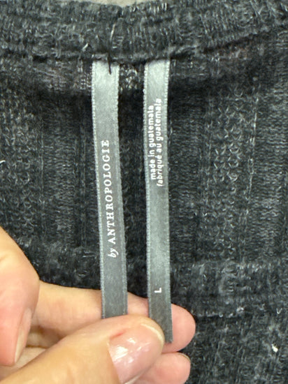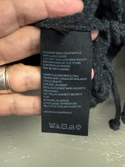 Description : Long-sleeve charcoal ribbed knit pullover with a round neckline, relaxed fit, and a gathered drawstring hem; the fabric is soft and slightly textured. The top has dropped shoulders and a casual, slouchy silhouette.