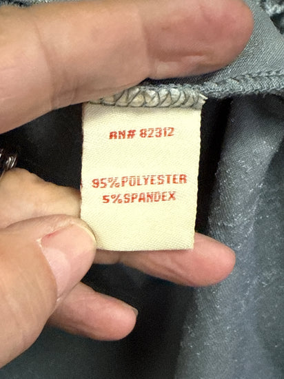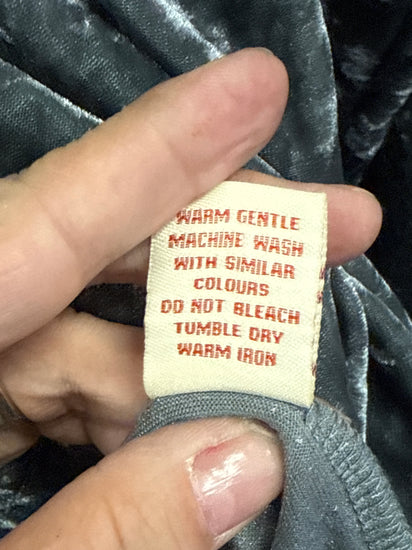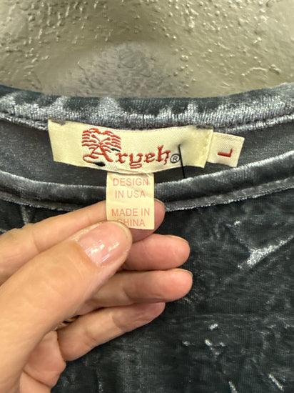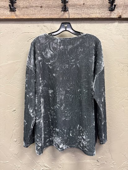Description : Long-sleeve crushed velvet top in a charcoal gray with a crew neckline, relaxed fit and a subtle high-low hem. Fabric has a textured, slightly crushed sheen throughout the front.