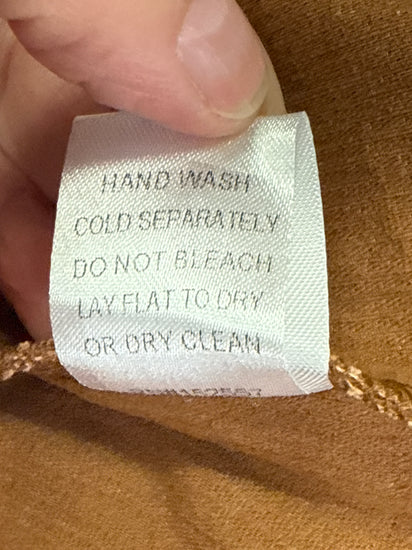 Description : Mini skirt in a warm camel corduroy with a front center row of metal snap buttons, belt loops, and vertical seam paneling for slight A-line shaping.
