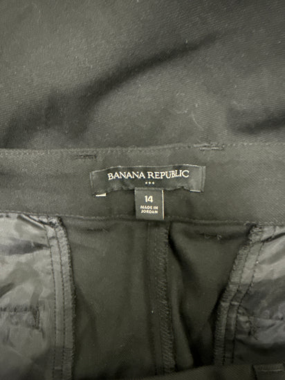 Description : Black trousers with a straight, slightly cropped leg and folded cuffs; front features include belt loops, a center zip/closure and slanted side pockets. The fabric is smooth and tailored for a classic, polished loo