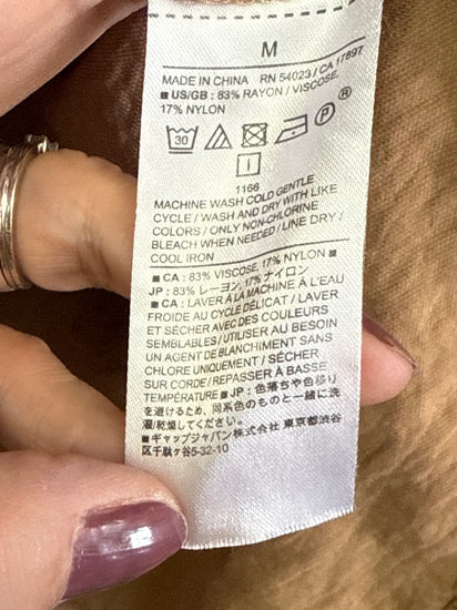 Description : Long-sleeve, collared button-up shirt in a light camel color with a slightly textured fabric, featuring two front flap chest pockets, button cuffs, and a relaxed oversized fit