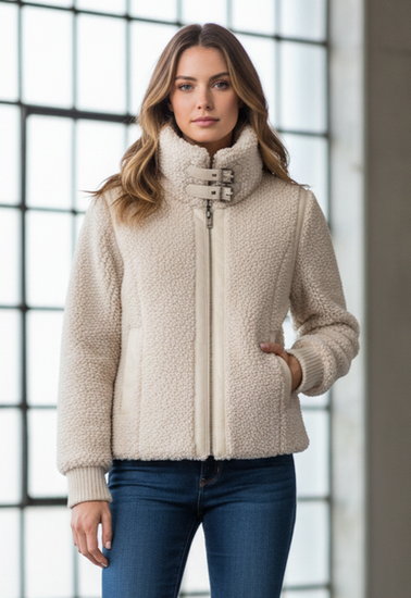Description : A short, fluffy zip-front jacket in a light cream sherpa fabric with a high collar, ribbed cuffs, two front welt pockets, and faux leather-trimmed zipper and buckle details at the collar. The texture is soft and cozy, giving a casual, insulated look.