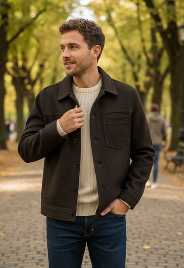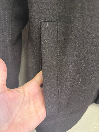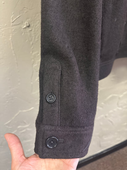 Description : Wool button-front jacket in a very dark charcoal/black with a spread collar, long sleeves, a single chest patch pocket, and two vertical side welt pockets; straight hem and visible seam detailing across the chest