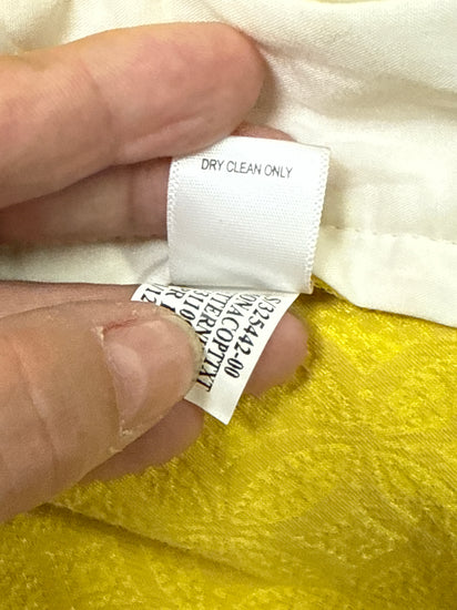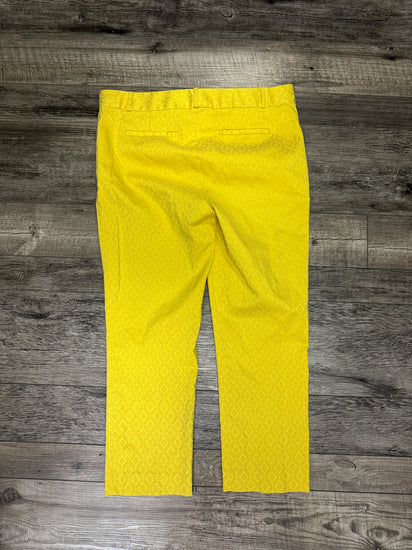 Description : Bright yellow slim straight trousers with a subtle geometric jacquard texture, featuring a front zip fly, belt loops and slanted side pockets visible from the front.