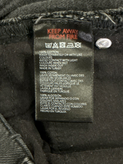 Description : High-waisted, wide-leg denim pants in faded charcoal gray with large black fabric patchwork on the right thigh and left knee area, visible five-pocket styling, belt loops, and raw-edged patch seams.