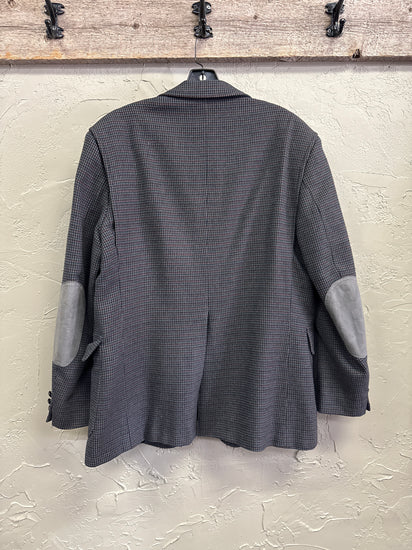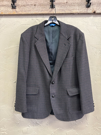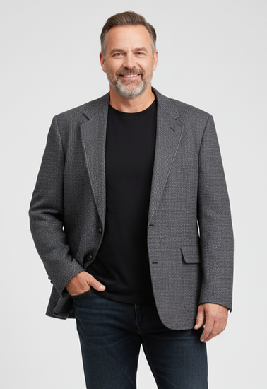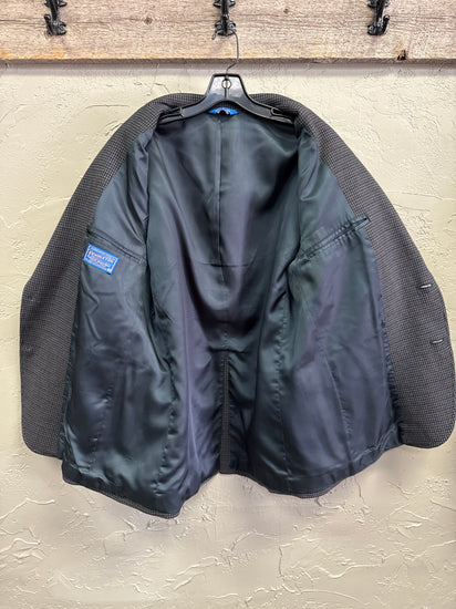 Description : Men's single-breasted blazer in a dark charcoal-gray with a subtle small-scale check pattern, notch lapels, two front flap pockets, two-button closure, and buttoned cuffs with a smooth dark inner lining visible at the front