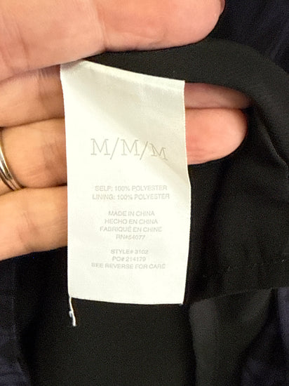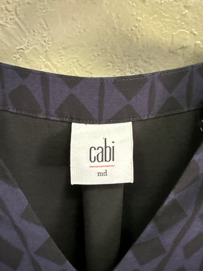 Description : A knee-length, long-sleeve shift dress in a deep navy blue with an all-over subtle geometric/diamond jacquard pattern, featuring a small V-notch at the round neckline and slightly gathered elastic cuffs. The fabric is lightweight and slightly sheer on the sleeves with an opaque body.