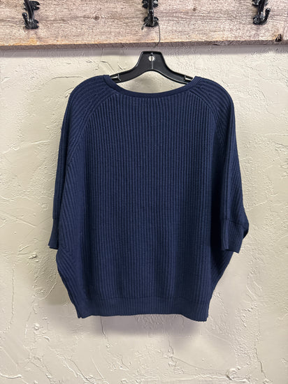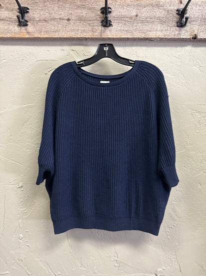 Description : Boxy navy blue knit sweater with a ribbed texture, crew neckline, drop shoulders, and elbow-length sleeves; hem and cuffs are finished with denser ribbing for structure.