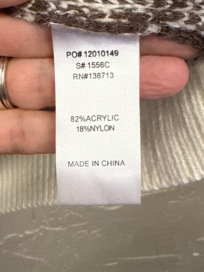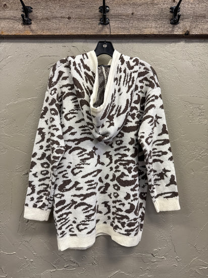Description : Cream knit hooded sweater with an all-over brown animal print, ribbed cuffs and hem, and a drawstring hood.