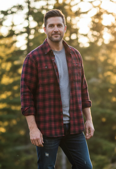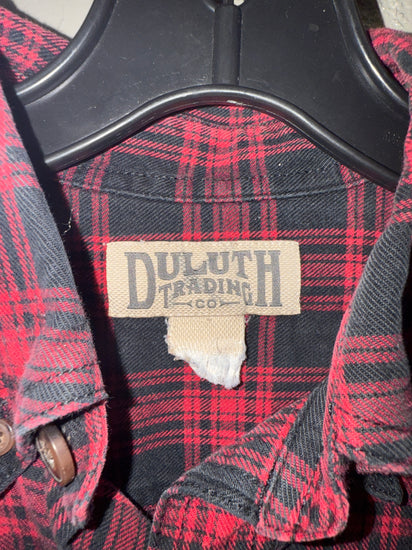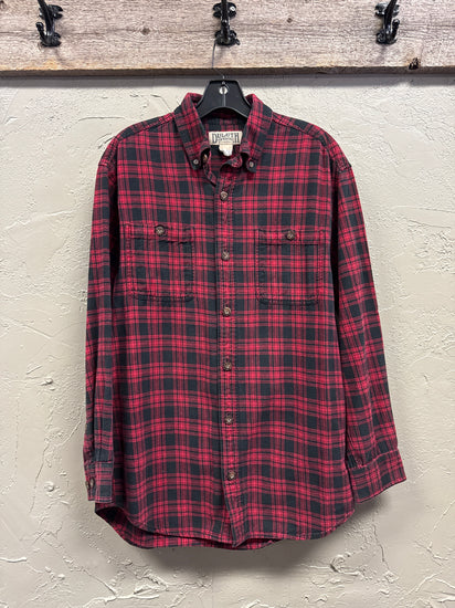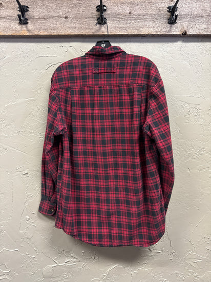 Description : Long-sleeve red and black plaid flannel button-up shirt with a button-down collar, two front chest flap pockets, and visible brown buttons down the center