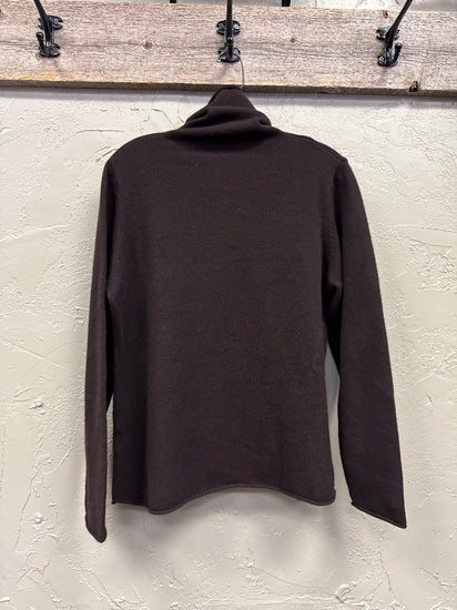 Description : Eileen Fisher, 100% cashmere sweater in a deep chocolate brown with a relaxed, slightly draped turtleneck/cowl and a smooth, fine-knit.