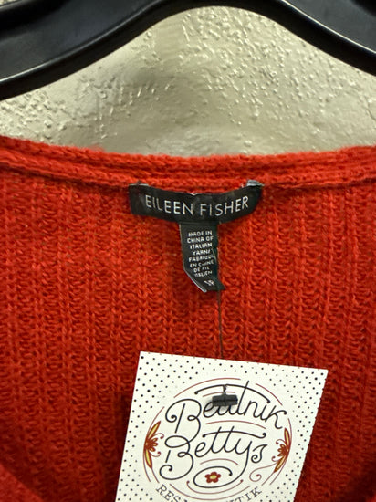 Description : Long-sleeve, V-neck knit sweater in a solid bright warm red with a slightly flared hem and a textured ribbed knit