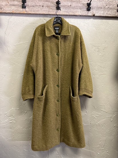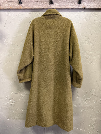 Description : Long knee-length moss-green textured bouclé coat with a button-front closure, spread collar, long sleeves with turned cuffs, and two front patch pockets. Price reflects ware on shoulder