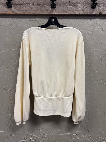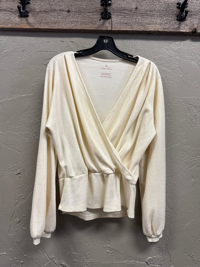 Description : This sophisticated top has the look of a wrap top, but the ease of a pullover silhouette, making it a stylish and effortless choice. The captivating sleeves and wide banded hem are ideal for any formal or casual occasion. Nursing friendly.