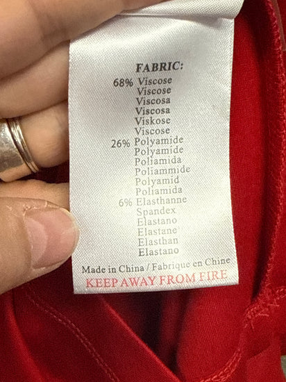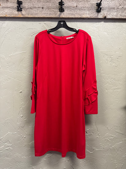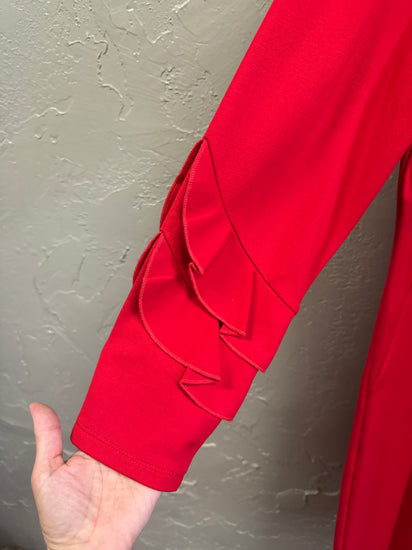Description : A knee-length, long-sleeve red dress with a round neckline and a simple A-line/shift silhouette, featuring tiered ruffle details on the sleeves and a smooth, slightly stretchy fabric. The front is unembellished aside from the sleeve accents and a back zip visible at the neckline.