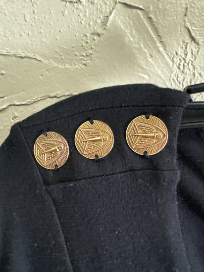 Description : Black knee-length dress featuring long sleeves, scoop neckline, and a fitted design. Special features include an open back with twised details and coin embellishments on the shoulders,