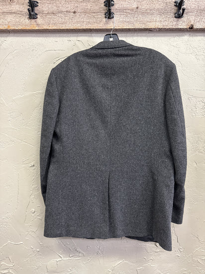 Description : Wool blazer in dark charcoal gray with a notched lapel, two-button front, flap pockets, a welt chest pocket, and a smooth dark satin lining visible at the front opening.
