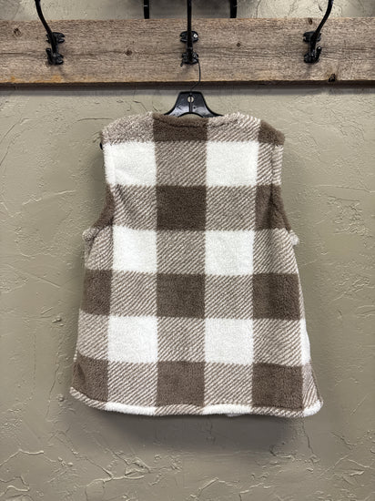 Description : Sleeveless open-front fleece vest in a large buffalo-check pattern of cream and taupe/brown with a soft, plush texture and two front patch pockets.