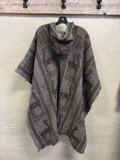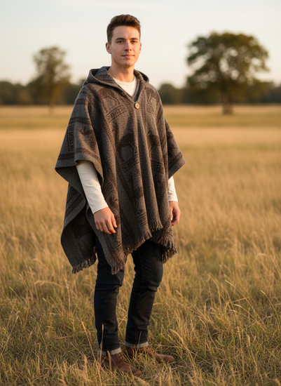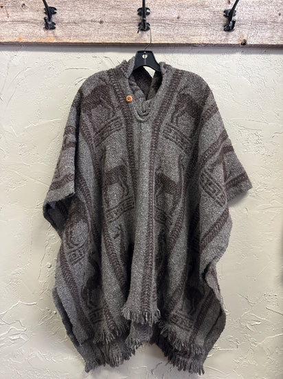 Description : Hooded poncho in mottled dark gray with darker geometric patterns across the front, featuring a V-shaped neckline secured by a single wooden button near the shoulder. The loose, draped silhouette has an attached hood, wide open sleeves and a fringed hem