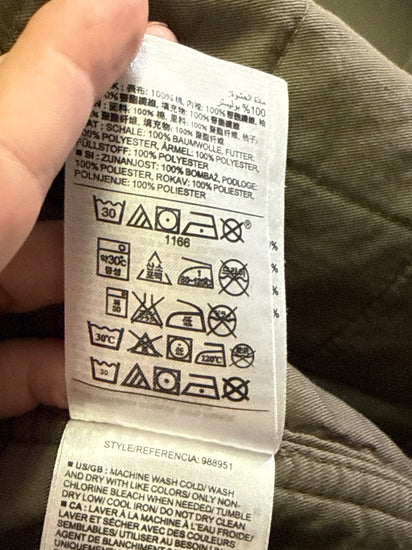 Description : Long army-green parka jacket with a detachable hood, front zip-and-button closure, drawstring hem, vertical slit hand pockets and large flap cargo pockets, plus visible seam detailing and a slightly washed cotton fabric.