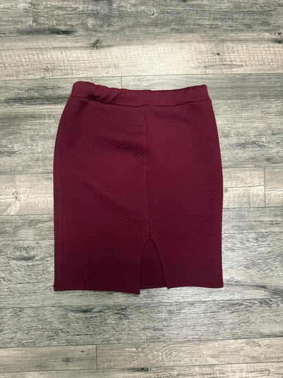 Description : A high-waisted, knee-length pencil skirt in a deep wine/burgundy color with a subtle quilted textured knit and a small front vent at the hem. The skirt has a clean, fitted silhouette and a simple waistband