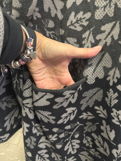 Description : Long knit button-up cardigan sweater in black and gray with an allover leaf jacquard pattern, round neckline, long sleeves, front patch pockets and a slightly flared A-line hem. The front shows tonal contrast from lighter gray leaves against a darker background.