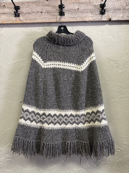 Description : Knit wool poncho in a medium charcoal gray with a ribbed funnel/turtleneck, horizontal cream and lighter-gray Fair Isle-style bands across the chest and near the hem, and a long fringe along the bottom edge. The silhouette is loose and cozy with raglan shaping at the neck and a textured, slightly fuzzy knit