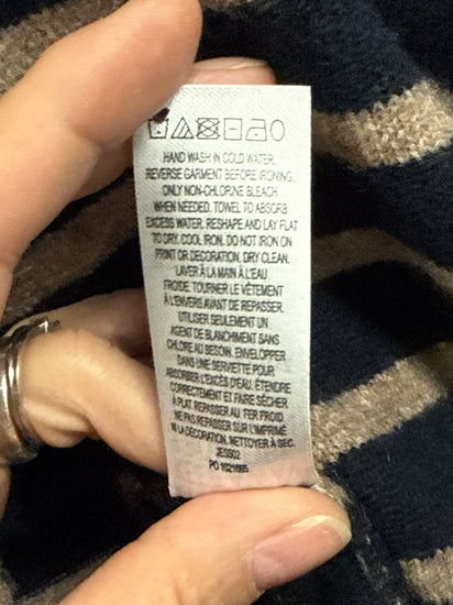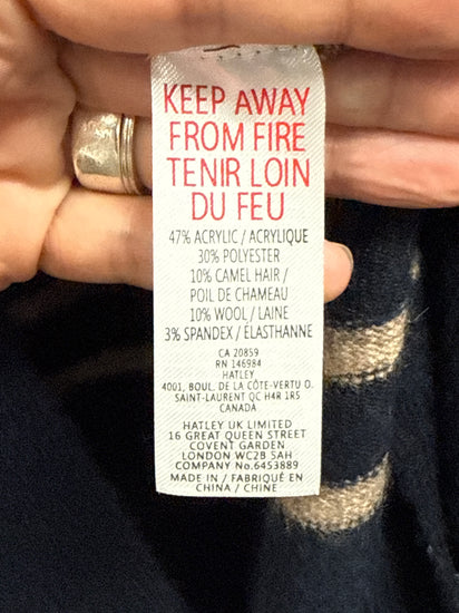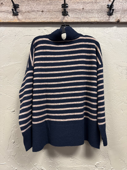 Description : Crafted from a rich blend of acrylic, polyester, and camel, the mock neck tunic in navy taupe stripes offers a luxurious feel and a striking look. The striped pattern is both bold and sophisticated, while the mock neck and tunic length provide warmth and coverage. Perfect for pairing with leggings or slim pants.