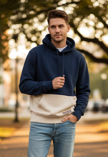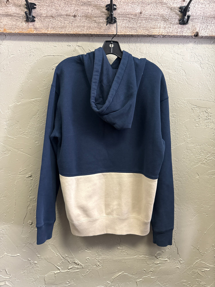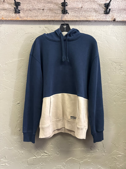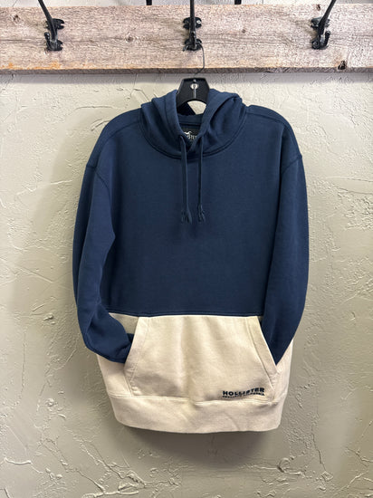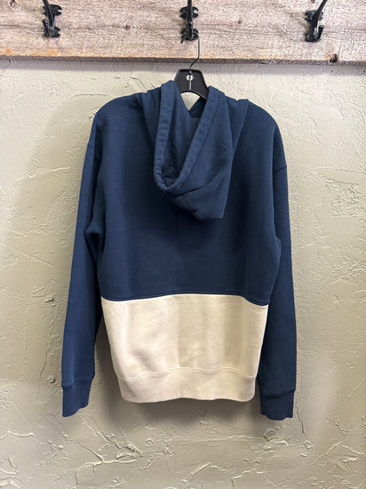 Description : Two-tone pullover hoodie with a deep navy upper and light cream lower panel featuring a front kangaroo pocket, plus a drawstring hood and ribbed cuffs and hem.