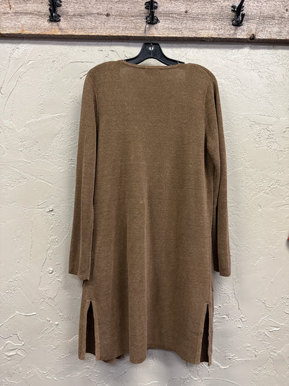 Description : Long open-front sweater coat in a warm medium brown with a subtle ribbed knit texture. It features a draped collar, long sleeves and two front patch pockets.