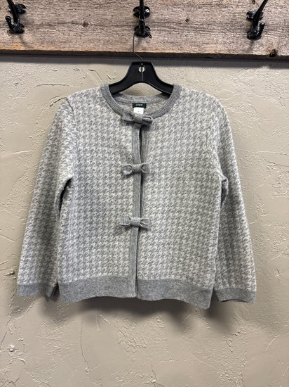 Description : Gray houndstooth, wool blend knit cardigan with three bow closures and a ribbed hem and cuffs