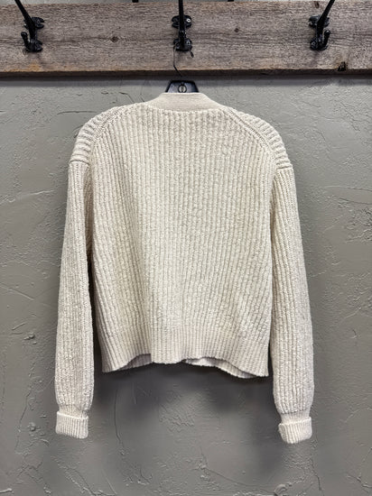 Description : Cream ribbed knit cardigan sweater with a deep V-neck, three brown buttons down the front, two rounded patch pockets, long sleeves and a slightly cropped hem. The fabric is chunky and textured with ribbed cuffs and hem