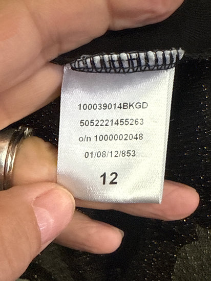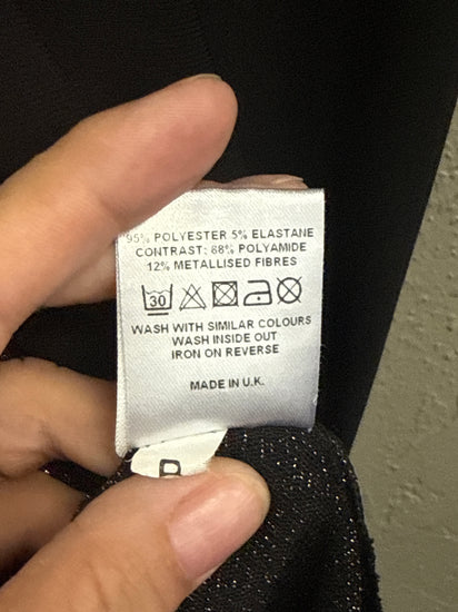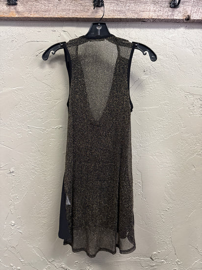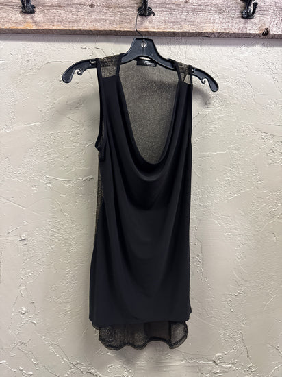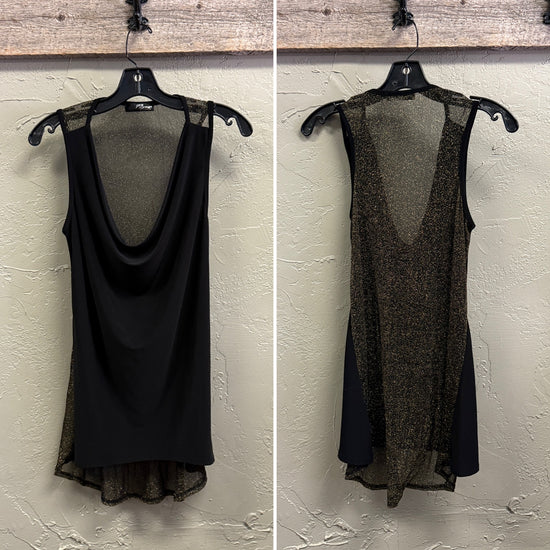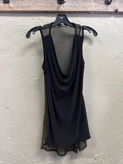 Description : Draped black sleeveless top with a cowl neckline, featuring sheer, metallic fabric in back for a super sexy look.