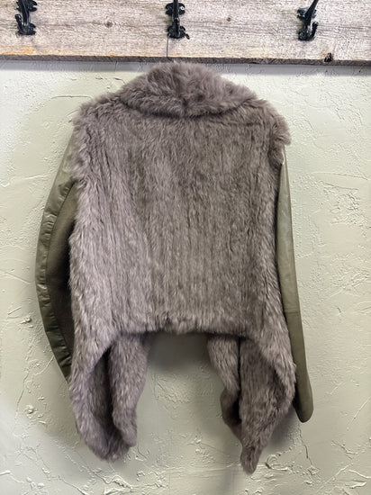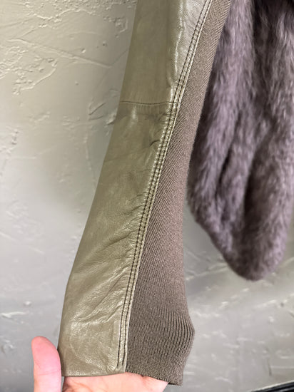 Description : Army green leather-sleeved, draped rabbit fur jacket