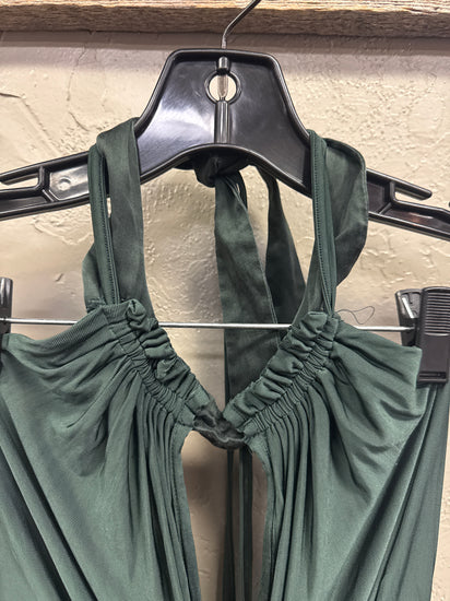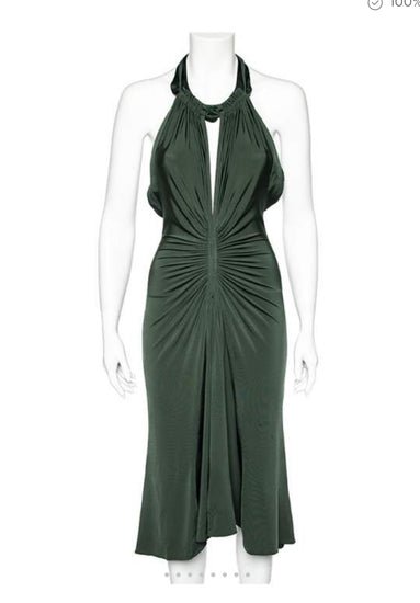 Description : A fluid romance of delicate details and a feminine silhouette. Created to fit you perfectly, this Just Cavalli midi dress in forest green has a halter neckline, ruched accents, and an open back.