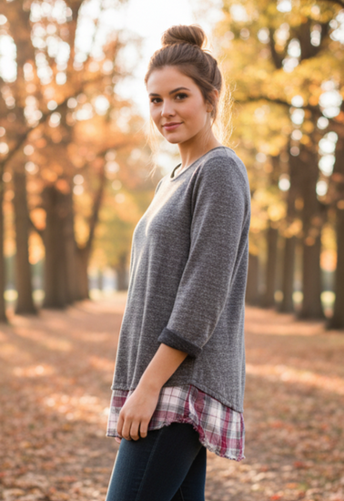 Description : Long-sleeve gray knit pullover with a round neckline and rolled cuffs, featuring a layered plaid ruffled hem in red, white, and gray for a casual layered loo