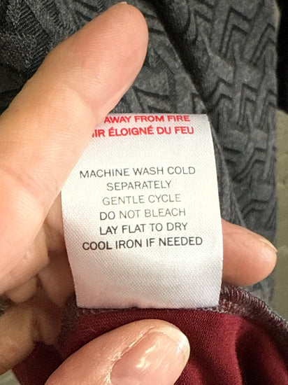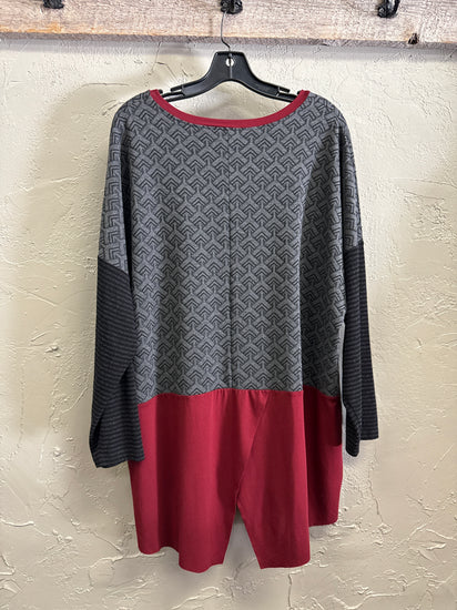 Description : Long-sleeve tunic top in charcoal gray with a repeating geometric pattern with a contrasting striped pattern on sleeves. Features a round neckline in deep burgundy which accents the burgundy block in back