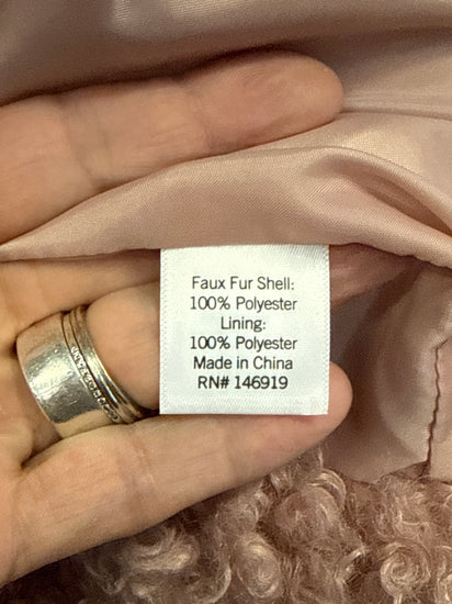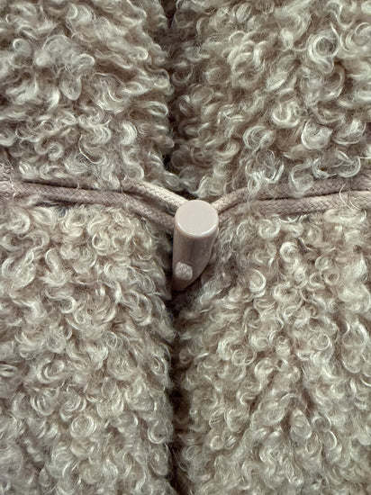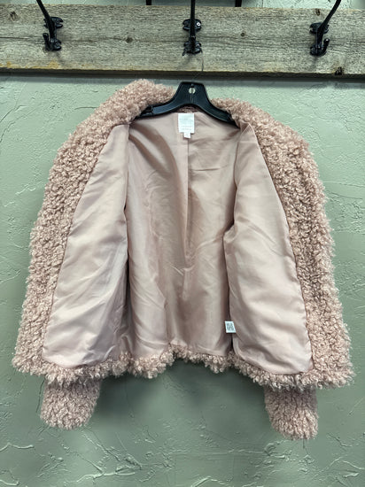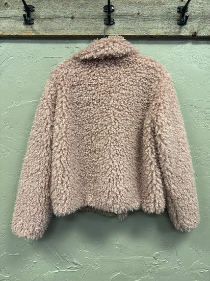 Description : Fuzzy, textured jacket in a light blush pink color. It features a pointed collar, toggle closures, and a slightly cropped hemline.